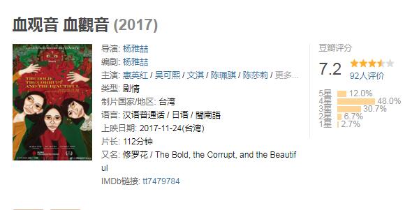 因为文淇获得了金马奖最佳女配角,而她的两部电影也收到了网友的关注,其中《血观音》也是成为了焦点。《血观音》在豆瓣的评分是7.2分,算中上水平。