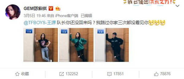 邓紫棋在微博写道:“@TFBOYS-王源队长你还没回来吗?我路过你家3次都没看见你。”并附上3张认证照。